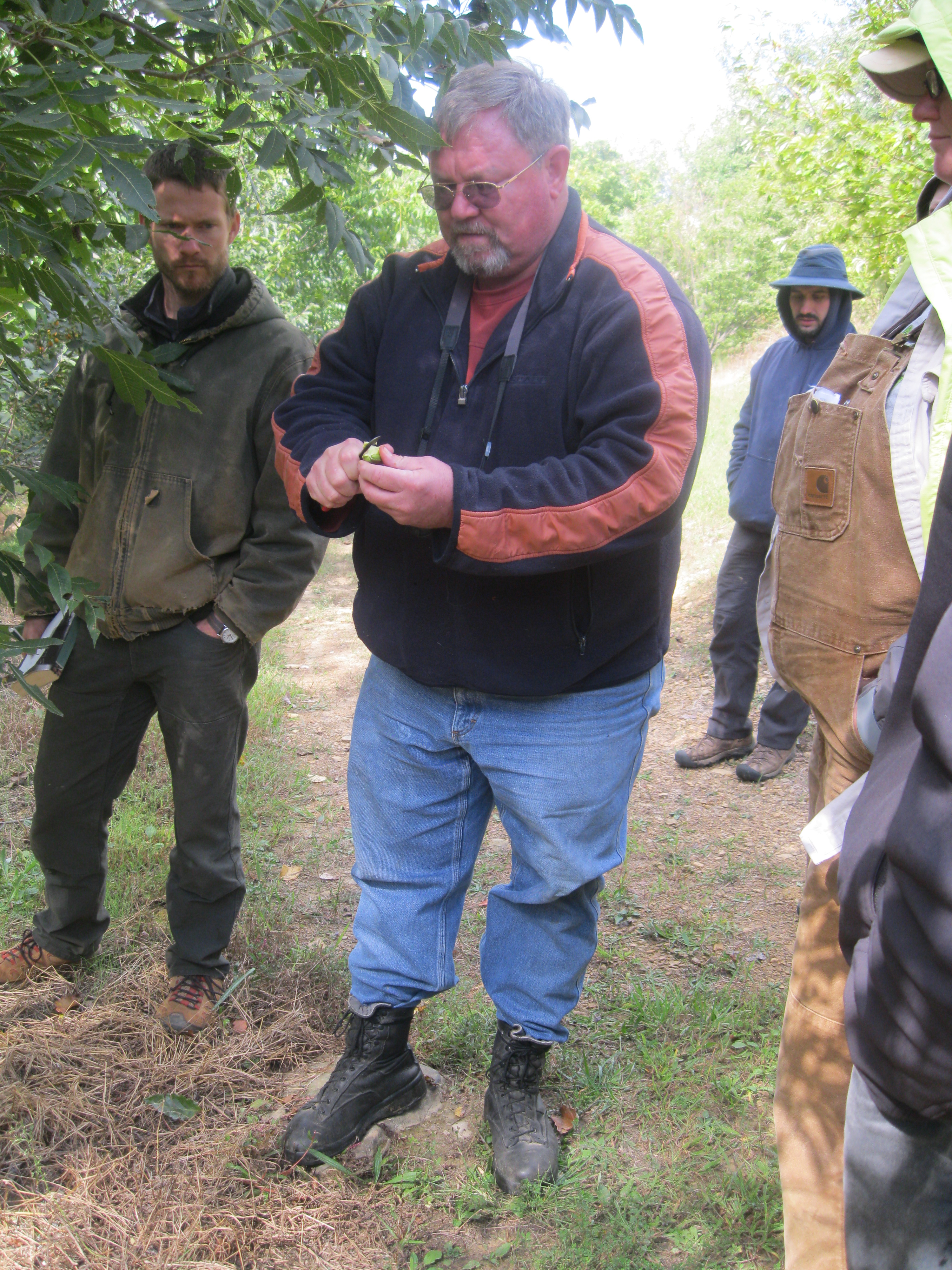 After a very merry ferry ride across a river, and one of our caravan nearly running out of gas in theKentucky countryside, we arrived at Cliff’s for an afternoon tour. Clifford England is a large manIMG_4267 with a presence to match his stoutness, and the group quickly fell into the world of Cliff and his menagerie of tree crops. In his army boots and sunglasses, he strolled us through his workshop shed, greenhouses, nursery beds, and across a few acres of his sprawling, hilly orchard. Cliff is growing dozens of varieties of chestnut, Asian persimmon, and jujube, as well as American